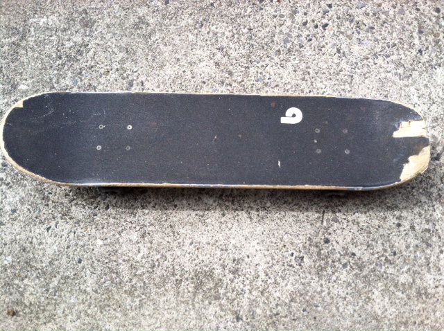 For a little more than six years I skated around on that board. By the end of its life my board had a fraying tail and a split nose. A small piece on the top of the deck had snapped out while my cousin and a friend were doing tricks, but I had hot glued it back on. The grip tape really needed to be replaced.